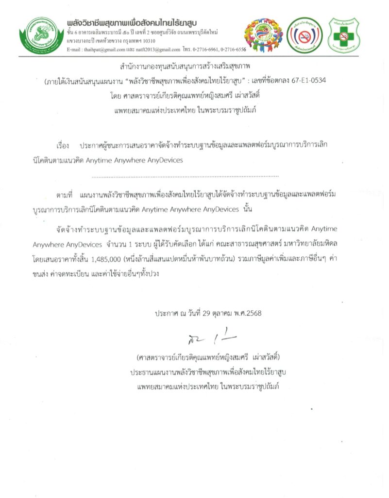 ประกาศผู้ชนะการเสนอราคาจัดจ้างทำระบบฐานข้อมูลและแพลตฟอร์มบูรณาการบริการเลิกนิโคตินตามแนวคิด Anytime Anywhere AnyDevices